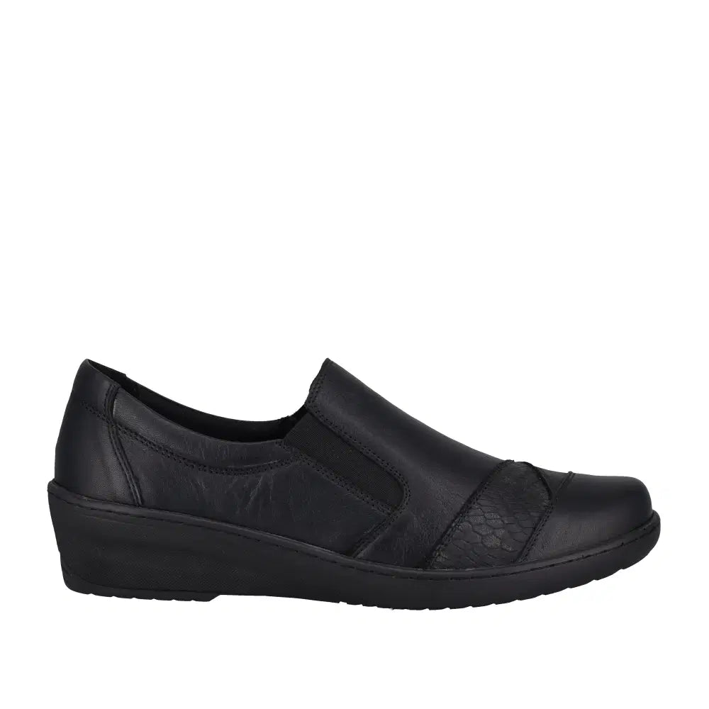 The CP736-18 lightweight slip-on shoe features detailed leather uppers and elastic gussets at the top of the foot to ensure a snug fit. The padded footbed provides all day comfort and the low wedge makes this shoe a stylish choice for either day or night wear.