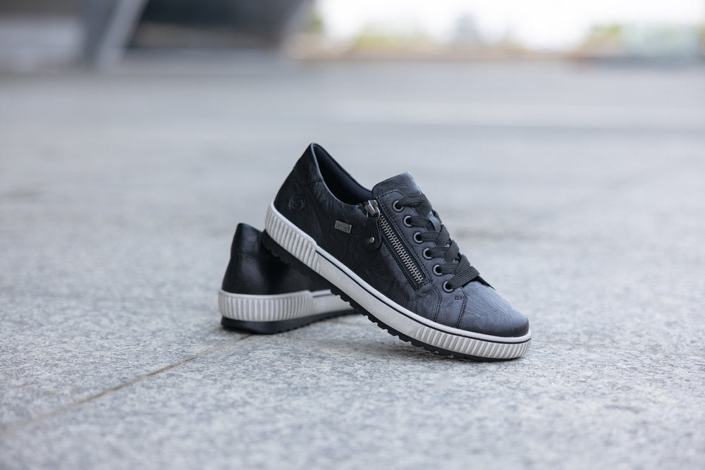 Clear the stage! These black remonte lace-up shoes made of smooth leather are not only ultra stylish, they also score with their comfort features. The clever combination of lacing and zipper guarantees a perfect fit and optimal support. The padded and removable insole and the flexible and grippy sole are special goodies on top. Furthermore, the comfort width offers your feet more freedom of movement in the forefoot area. Thanks to the remonteTEX technology, the shoe is water-repellent and offers protection from the wind. More comfort is not possible! |