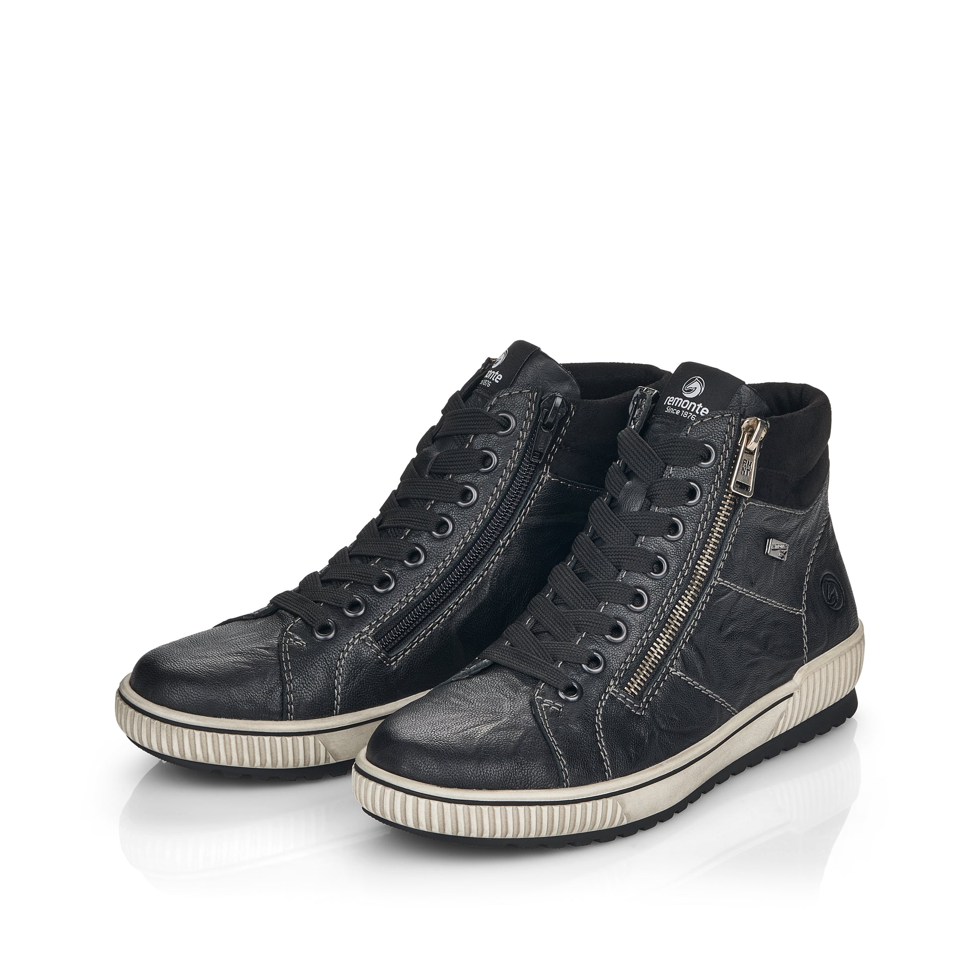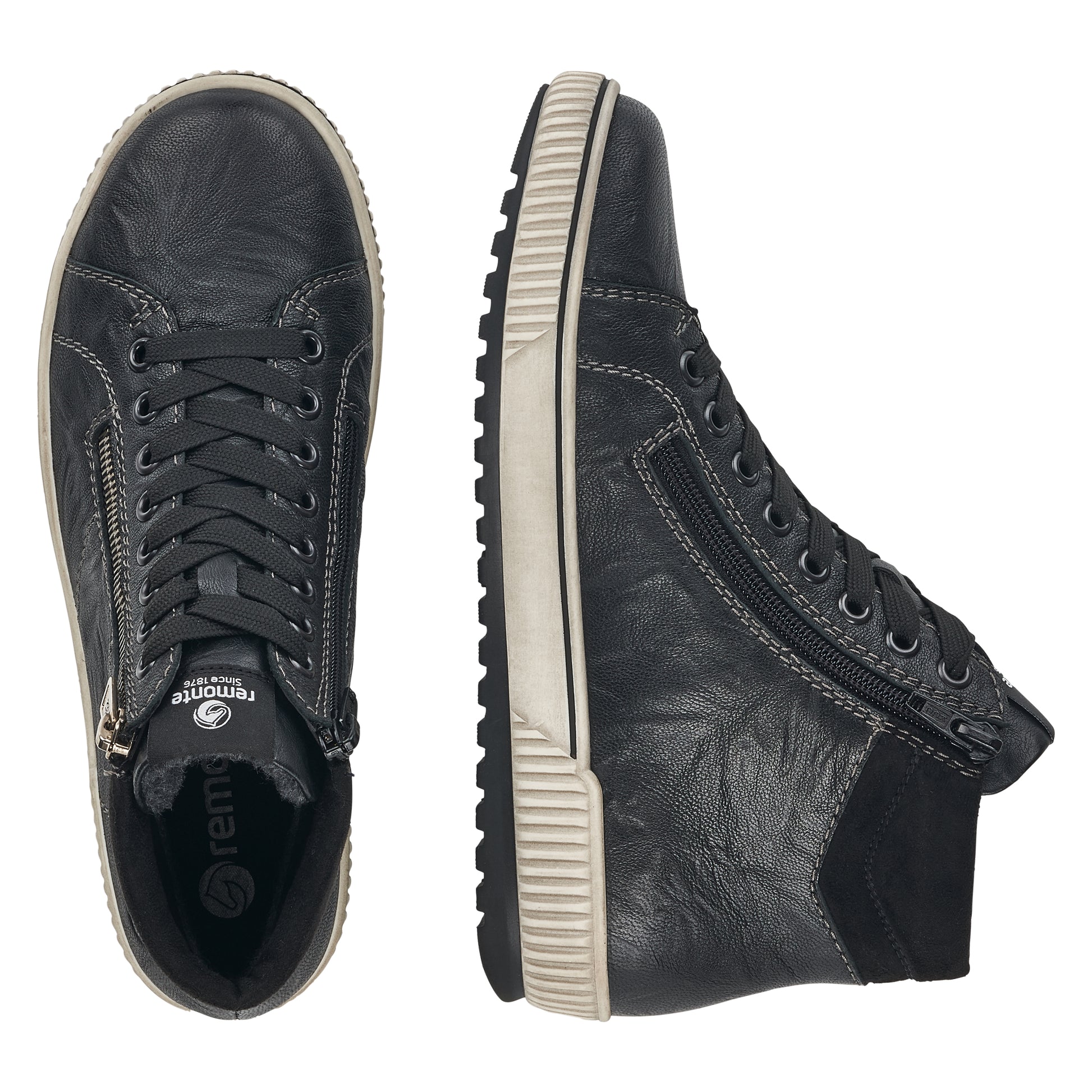 Clear the stage! These black remonte lace-up boots made of smooth leather know how to inspire. The lacing complements the zipper and thus guarantees optimal support and perfect fit. The contrasting beige stitching adds that certain something. The grippy and cushioning sole together with the padded and removable insole creates a feeling of well-being at every step. The comfort width gives you more space in the shoe. Thanks to the remonteTEX technology, the boots are water-repellent and therefore suitable for any weather. You can't get more style than this! |