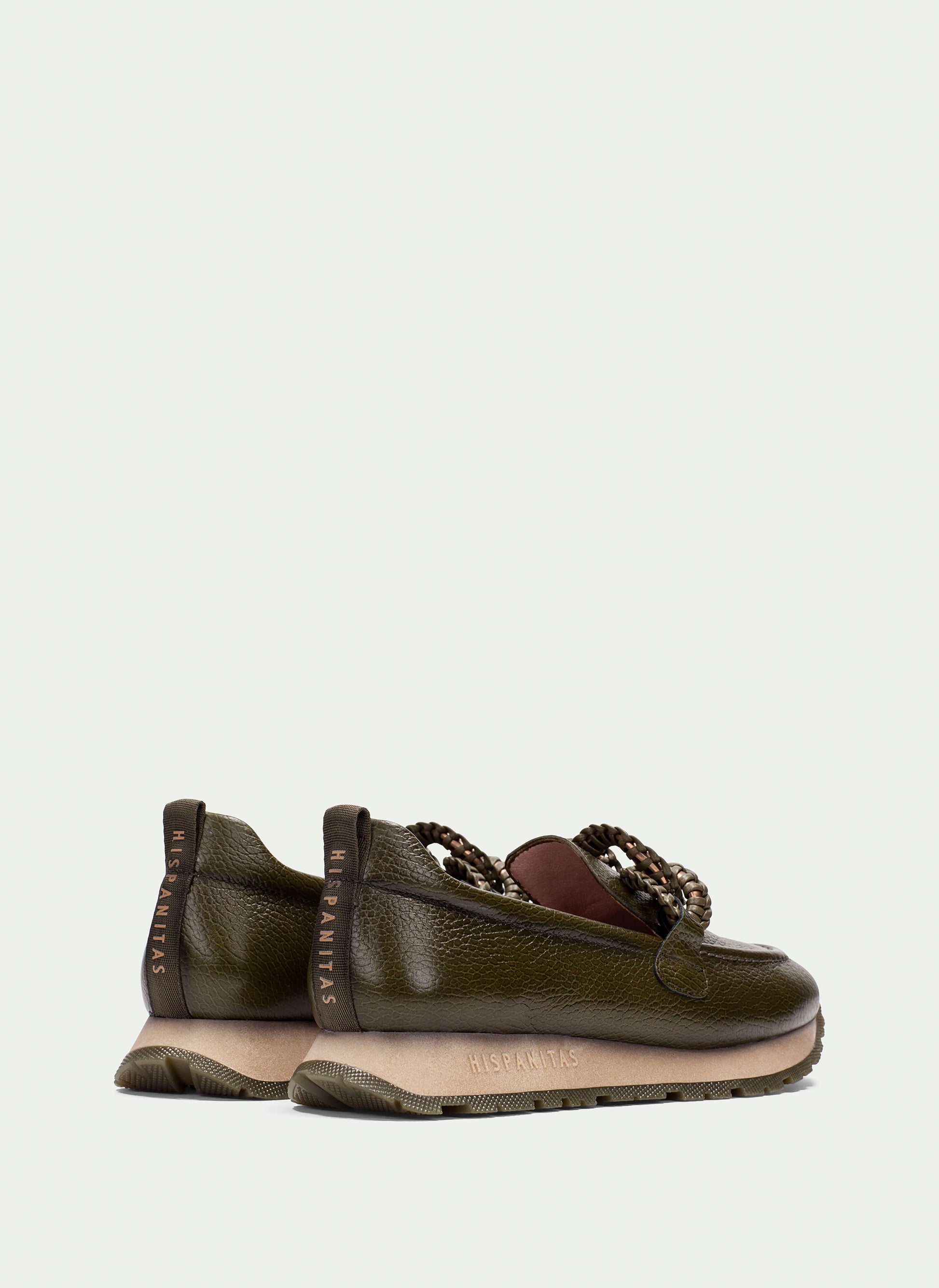 Effortlessly stylish, the KANSAS-HISPANITAS combines contemporary design with functional comfort. This slip-on loafer features a distinctive chain accent and textured leather upper, paired with a supportive 3 cm thermoplastic rubber sole engineered for impact absorption. The non-animal synthetic lining offers superior breathability and temperature regulation, while Triflow Technology delivers triple-zone cushioning throughout the tread. An anatomical insole provides customizable arch support, making this versatile shoe equally suited to casual outings or professional settings.