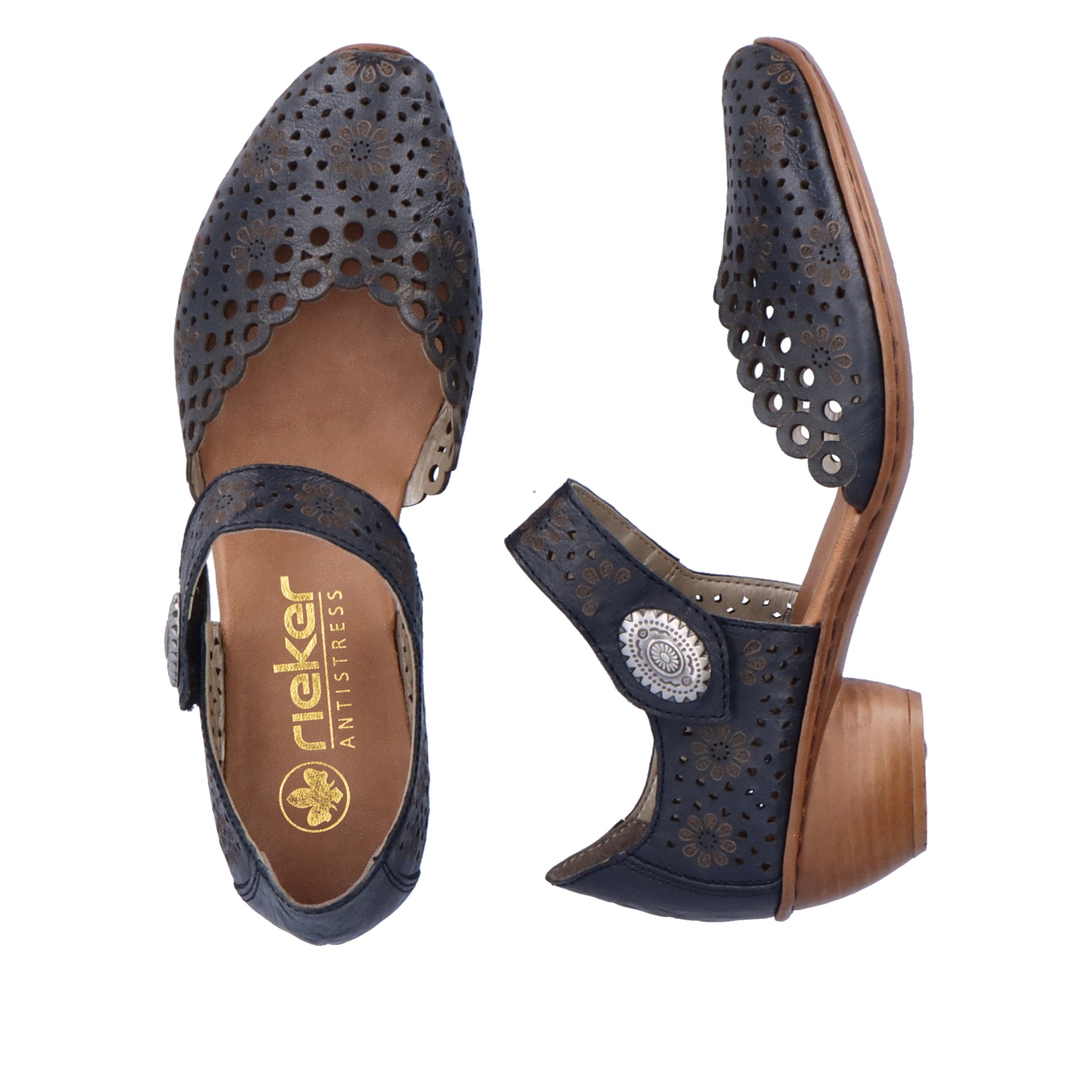 Favourite shoe potential! You won't want to take off these black Rieker pumps made of smooth leather. The stitched construction ensures a robust finish and a flexible sole that combines stability and flexibility. A hook and loop fastener allows for a quick and easy entry. The open-work style is a real eye-catcher. The light and shock-absorbing sole with block heel ensures a pleasant wearing sensation. |
