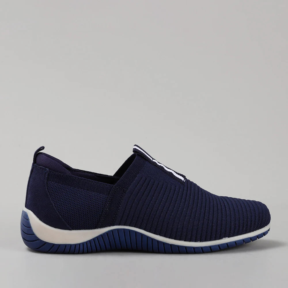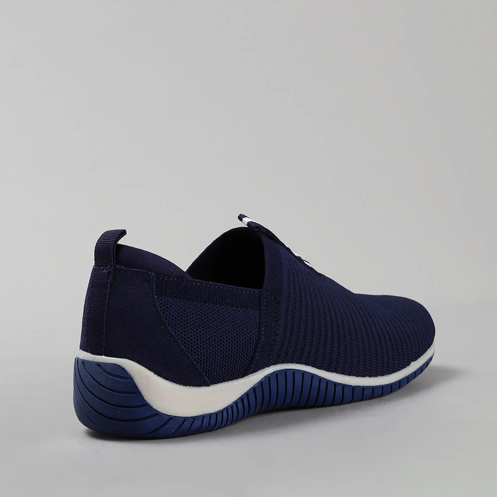 A navy knit slip‑on built for easy, everyday comfort. Flexible ribbed upper keeps the fit breathable and light. Set on a white‑and‑blue sole with reliable traction. Clean, sporty, and effortless for all‑day wear.