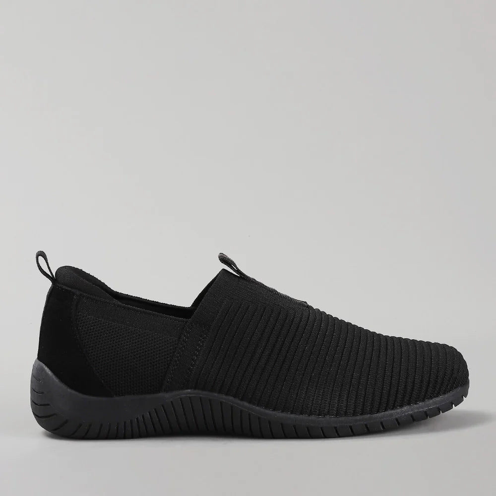 A black knit slip‑on built for easy, everyday comfort. Flexible ribbed upper keeps the fit breathable and light. Set on a white‑and‑blue sole with reliable traction. Clean, sporty, and effortless for all‑day wear.